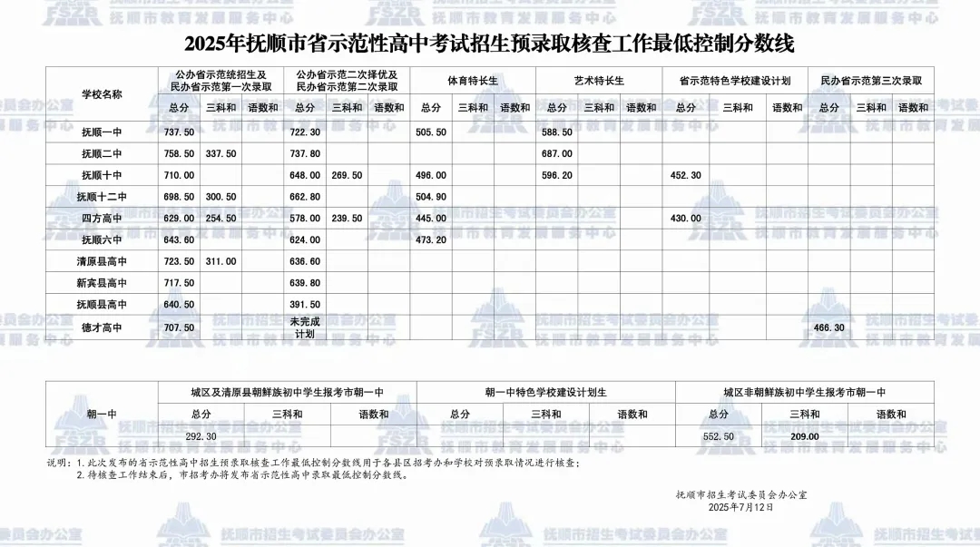 2025年抚顺市省示范性高中考试招生预录取核查工作最低控制分数线